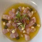 Luego del café, comenzó el reconocimiento del campo de juego, bajamos a la cocina de producción, puso salmones (no rosados), anchoas de banco y chernias arriba de la mesada y me dijo esto es lo que pescamos nosotros, o los pescadores de anzuelo de Mar del Plata, pesca que procesamos y ofrecemos al comensal